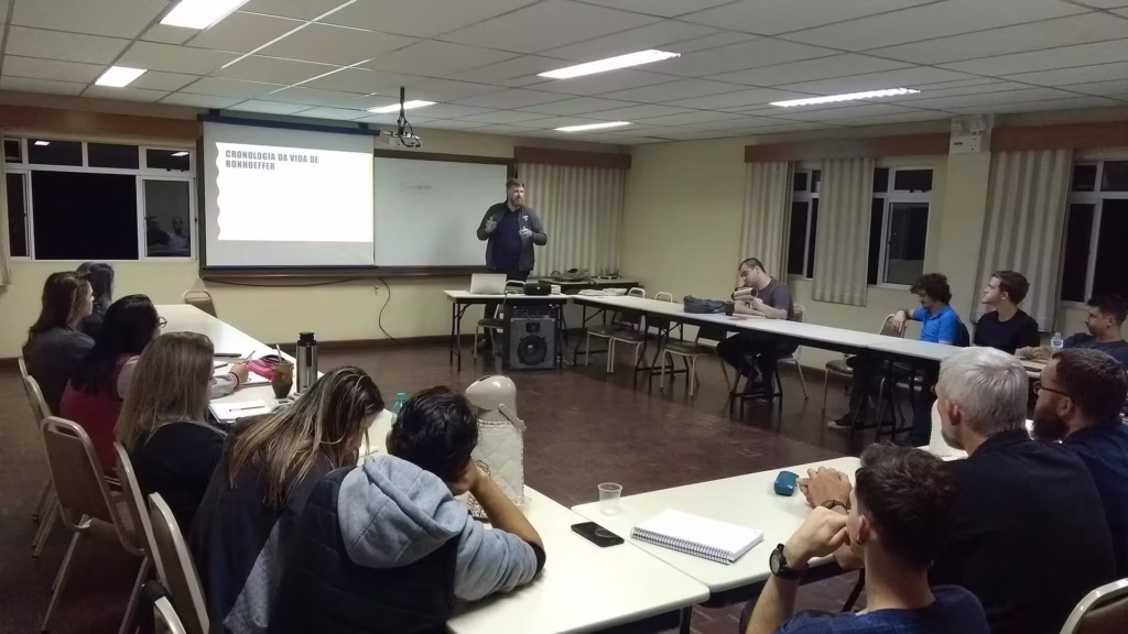 Durante a última semana, os acadêmicos do 1º ao 3º ano do Bacharel em Teologia da FATEV estiveram participando do 1º seminário sobre a vida e obra de Dietrich Bonhoeffer. O nosso convidado para palestrar durante estes dias é o Doutorando em Teologia pela Faculdades EST, Wilhelm Sell. Ele pesquisa a relação entre antropologia e ética no pensamento de Dietrich Bonhoeffer.